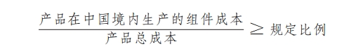 产品在中国境内生产的组件成本占比应当达到规定比例,计算公式为: